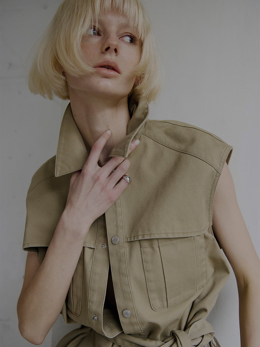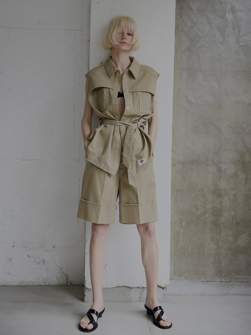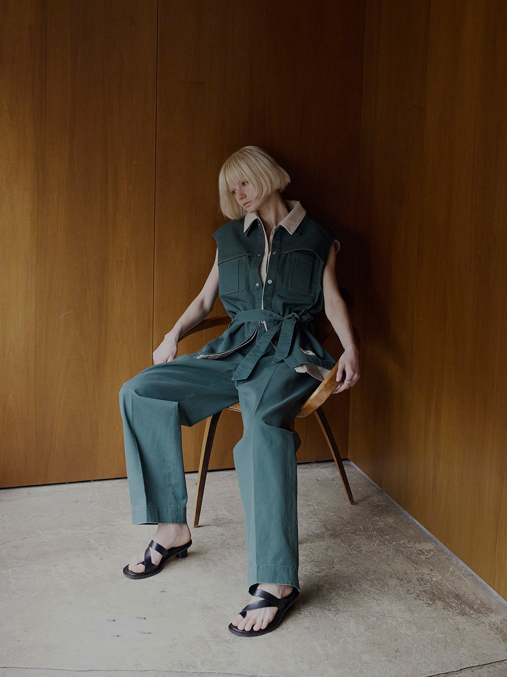 本コレクションでは、オーバーオール型ドレス、ノースリーブジャケット、タックパンツ、ハーフパンツの全4型を展開。