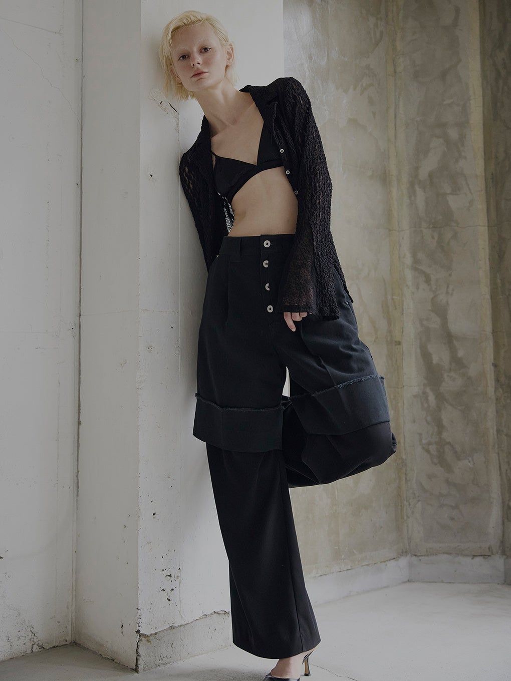 ウエストのタックが膝あたりで広がることで、絶妙なバランスのストレートシルエットを表現しています。