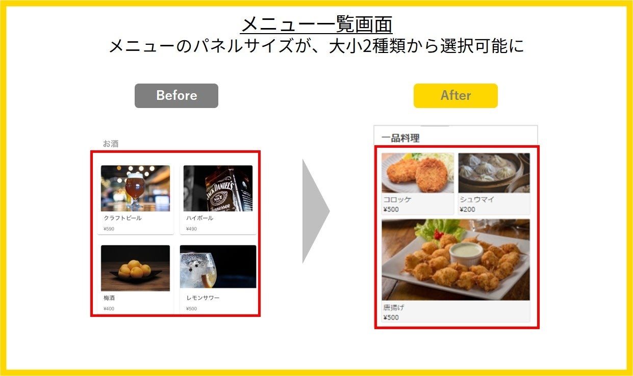 メニュー画面を全体的に刷新することで、お客様がさらに見やすく、使いやすいデザインを追求しました。また、お店側のメリットとしては、より紙のメニューブックに近い表現ができるようになりました。