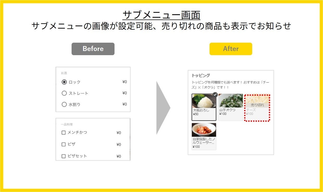サブメニューに画像が設定できるようになりました。また、これまで品切れの商品を非表示としていましたが、「売り切れ」として表示することが可能になりました。