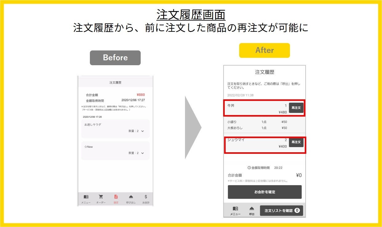 注文履歴画面のデザインが新しくなり、「再注文」から前に注文した商品をもう一度注文できるようになりました。(注文した商品は、注文リストに自動で追加されます)