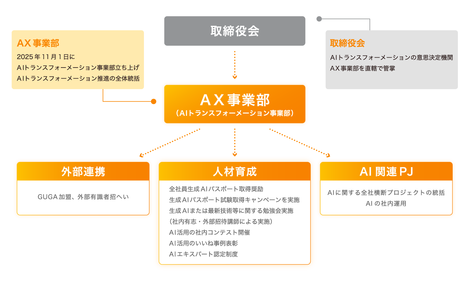 AX事業部を中心に、「外部連携」「人材育成」「AI関連PJ」の3つの機能を統括し、取締役会がAIトランスフォーメーションの意思決定機関として戦略を監督する体制で、全社横断的にAI活用を推進しています。