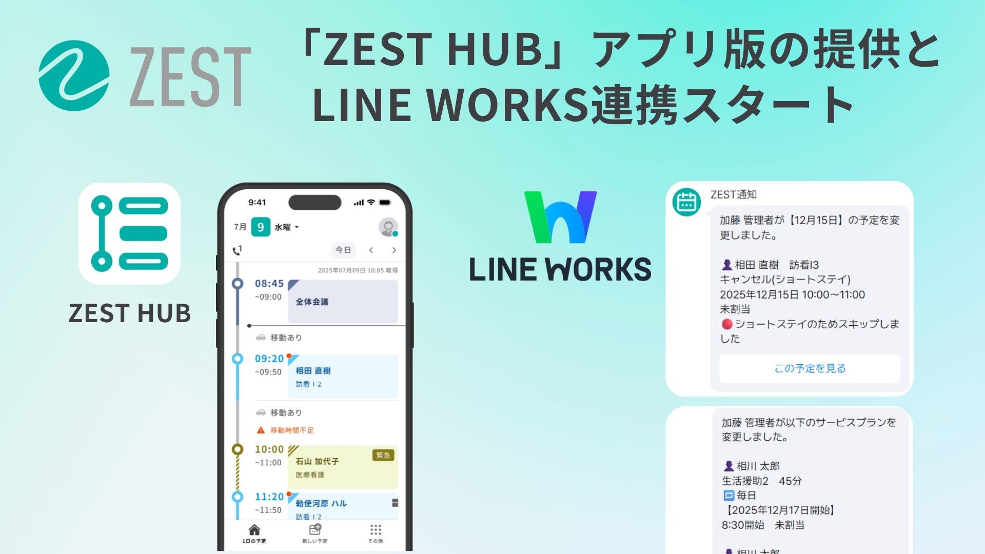 株式会社ゼスト(本社:東京都新宿区、代表取締役社長 CEO:一色淳之介)は、在宅医療・介護向けの収益改善プラットフォーム「ZEST」において、この度、初のスマートフォン・タブレットアプリ「ZEST HUB」の提供と、LINE WORKS株式会社が提供するビジネスチャット「LINE WORKS」との連携を開始したことをお知らせします。