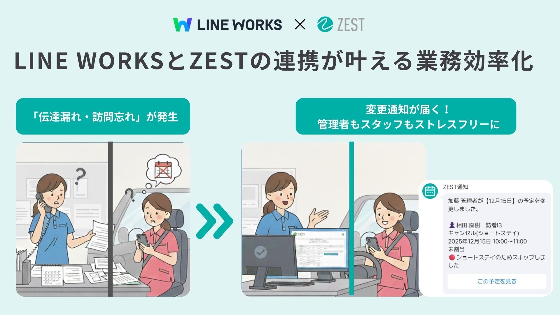 「現場の『困った』を解決し、新しい『当たり前』をつくる」今回のリリースは、単なる機能追加ではなく、「在宅医療・介護全体を支えるインフラ」へと進化させる第一歩となりました。特にモバイルアプリでの「オフライン対応」は、情報通信インフラに依存しがちな現代において、災害時や電波の不安定な地域で働く現場スタッフの安全と利用者へのサービス継続を守るという、BCPの観点から非常に重要な意義を持っています。また、LINE WORKS連携は、ZESTが「訪問スケジュール」という現場で最も変化しやすく、共有が難しい情報を、外部の優れたコミュニケーションツールと連携させることで、情報連携のボトルネックを解消する一歩となります。ZESTは今後も、現場の声を真摯に受け止め、業界の枠を超えたプロダクト連携を強化することで、「ZESTさえあれば、すべての在宅医療・介護業務が円滑に進む」という未来を実現してまいります。