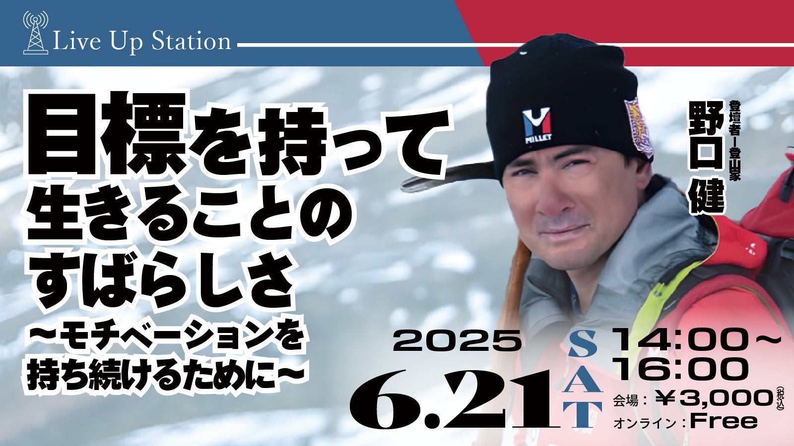 ”Live Up Station”第4回特別ゲストは、登山家として富士山やエベレスト清掃活動など環境保護活動にも尽力している野口健氏をお迎えします。野口氏が登山や環境保護活動の中で、国も文化も違う人たちが集まるチームをどのようにまとめて活動を続けたのか。そして、活動を続けるモチベーションをどのように保ち続けるのか。山での経験からチームをまとめ上げ活動のモチベーションを維持するコツを特別にお話しいただきます。
