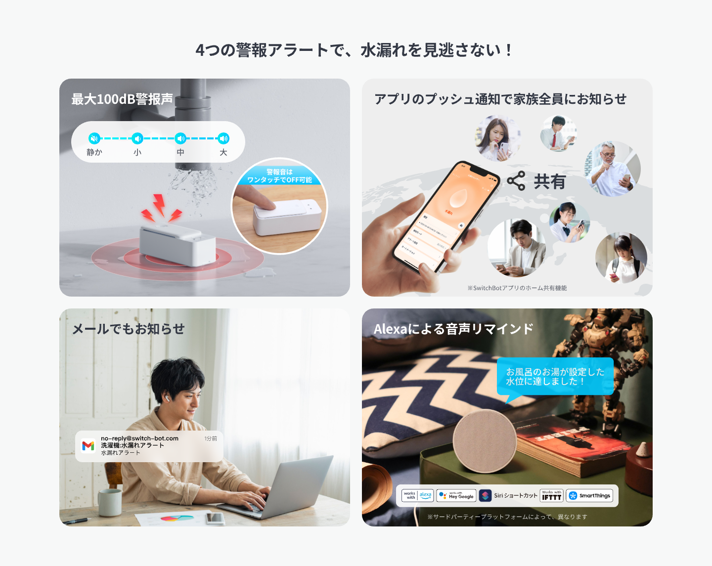 最大100dBの大音量で警報を鳴らし、水漏れをお知らせします(音はワンタッチでOFFにできます)。同時に、登録されている家族・メンバー全員へアプリとメールでお知らせ。Alexaに繋げば、音声でのお知らせも可能です。