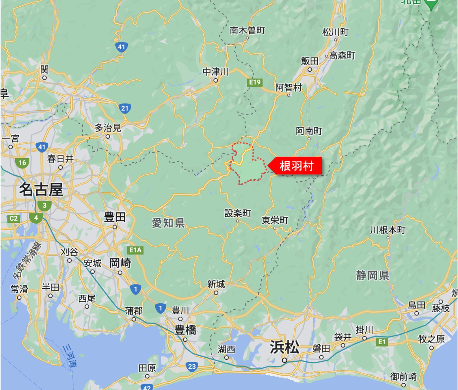 村内を西から北へ向かって一般国道153号が縦貫し、中央から南へ主要地方道設楽根羽線が、東へ主要地方道阿南根羽線がそれぞれ分岐しており、一般国道153号及び主要地方道設楽根羽線を通じ、名古屋市や豊田市、豊橋市、静岡県浜松市などへアクセスが可能で社会的交流も古くから活発に行われてきました。名古屋市へは車で約2時間、豊田市・豊橋市・浜松市へは約1.5時間、長野県飯田市へは約50分の距離にあります。また、一級河川矢作川の源流地であり、愛知県三河地方の重要な水源地でもあります。