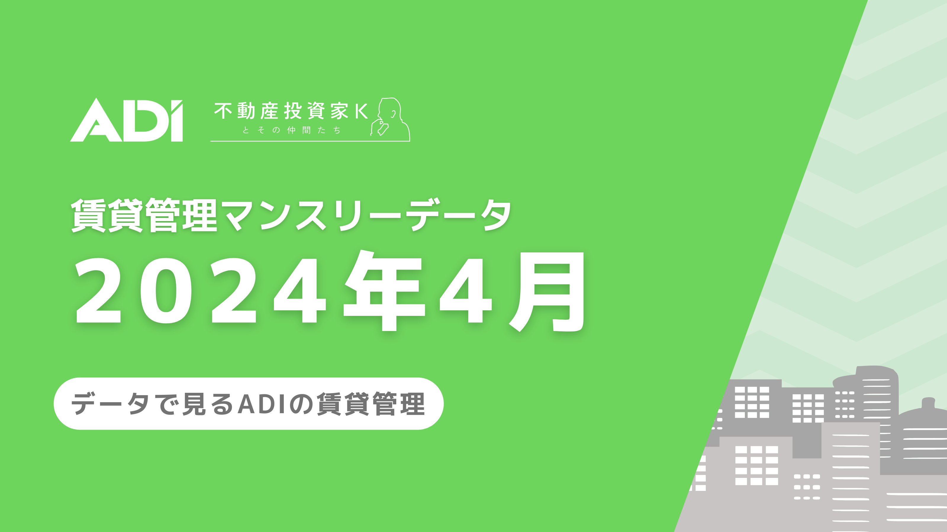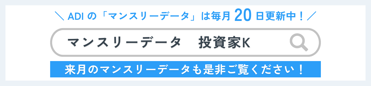 ADIが管理している集合住宅の賃貸管理状況を、毎月20日頃に「マンスリーデータ」として配信しています。賃貸管理データを定期的に公開することで事業の透明性を高め、オーナーさまや投資家の皆さまをはじめとする多くのステークホルダーの皆さまに、当社の事業内容や取り組みを知っていただく機会としていただければと考えております。より詳しいマンスリーデータ(2024年4月)は、不動産投資メディア「不動産投資家Kとその仲間たち」よりご確認いただけます!