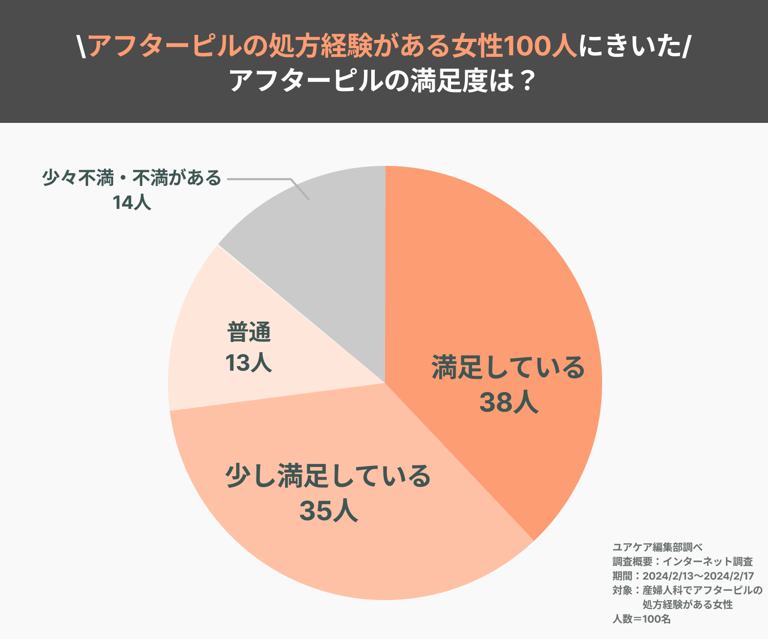アンケート回答者に「アフターピルの満足度」について聞いたところ「満足している・少し満足している」と回答した人が73%と大半を占めました。
