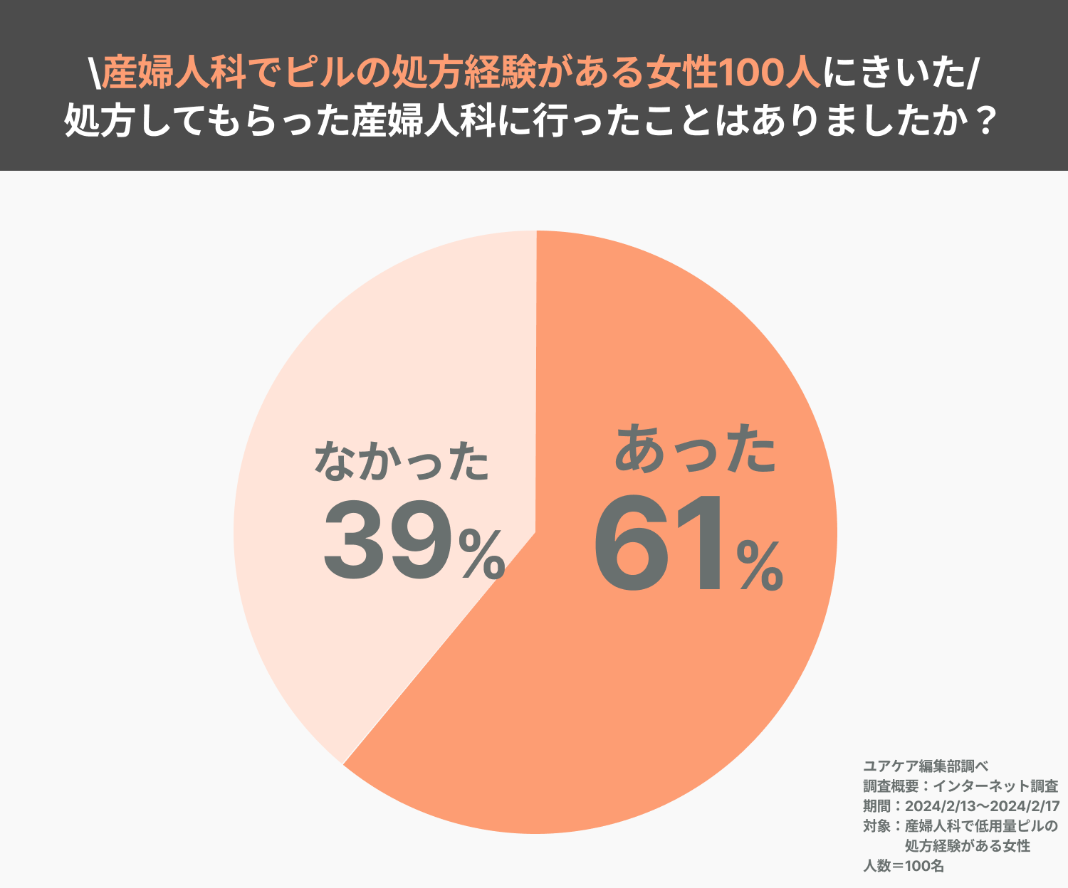 アンケート回答者に「処方してもらった産婦人科に行ったことはありましたか?」と聞いたところ「あった」と回答した人が61%と半数以上を占めました。