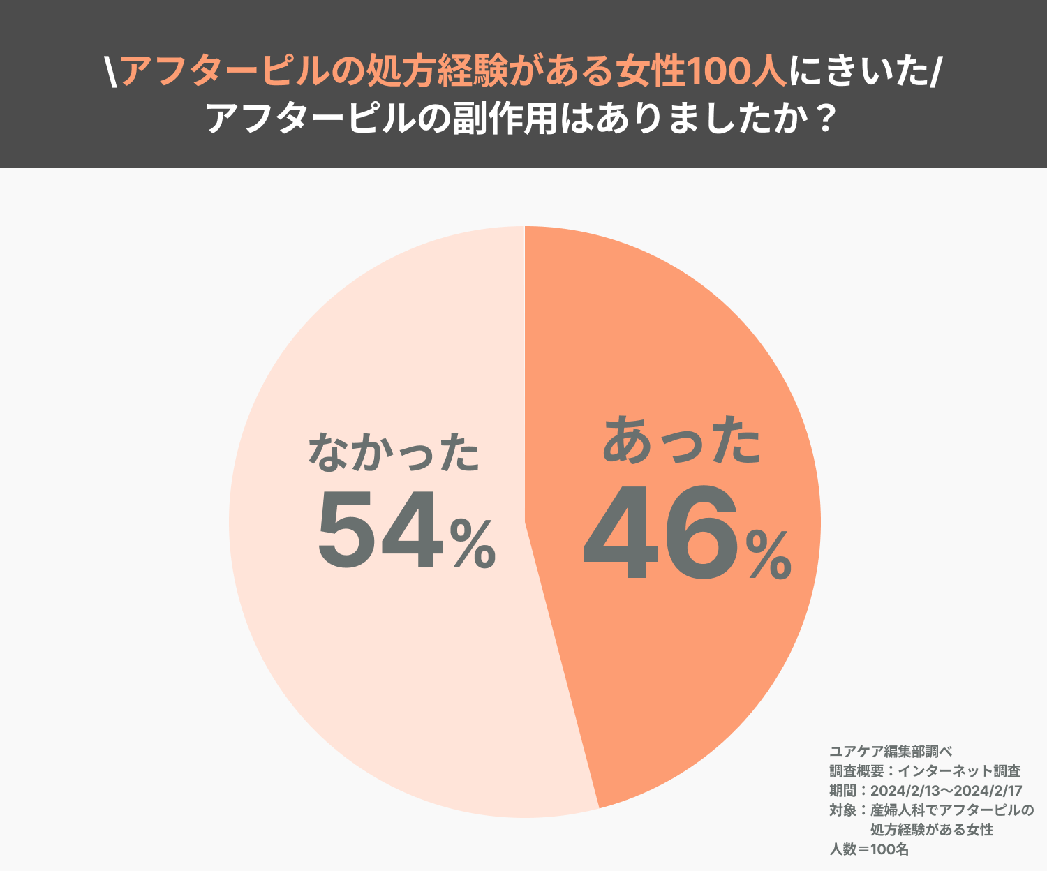 アンケート回答者に、アフターピルを飲んでいるときの副作用に関して聞いたところ、「副作用があった」と回答した方は40%と半数以下であることがわかりました。