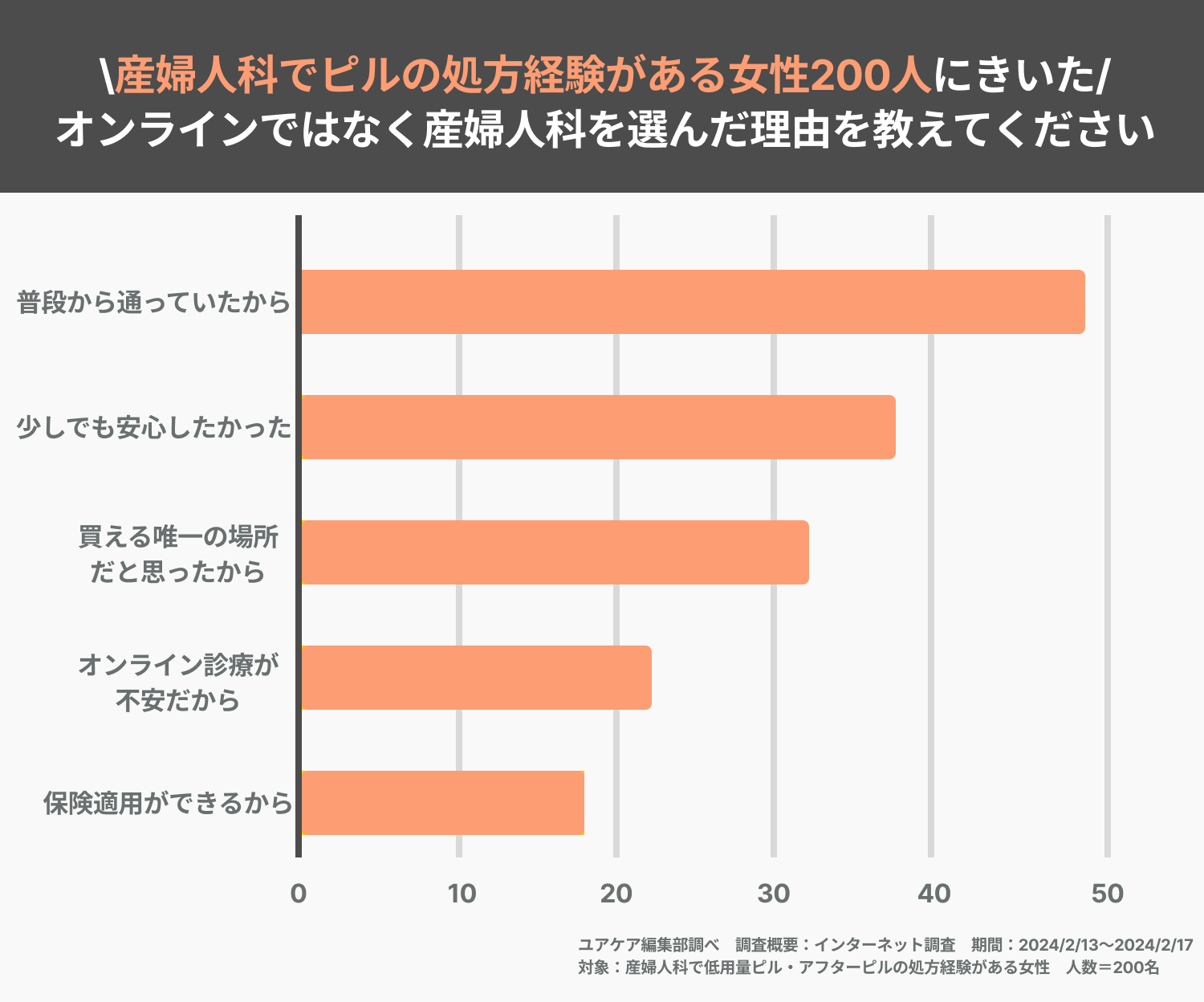 ピル処方でオンライン診療ではなく産婦人科を選んだ理由についてのアンケートを実施したところ、「普段から通っていたから」(49人)「少しでも安心したかったから」(38人)と、安心に関する回答が上位を占めました。4番目に多かった「オンライン診療が不安だったから」(21人)と合わせると、半数以上の方がピル処方において産婦人科に安心感を求めていることがわかりました。
