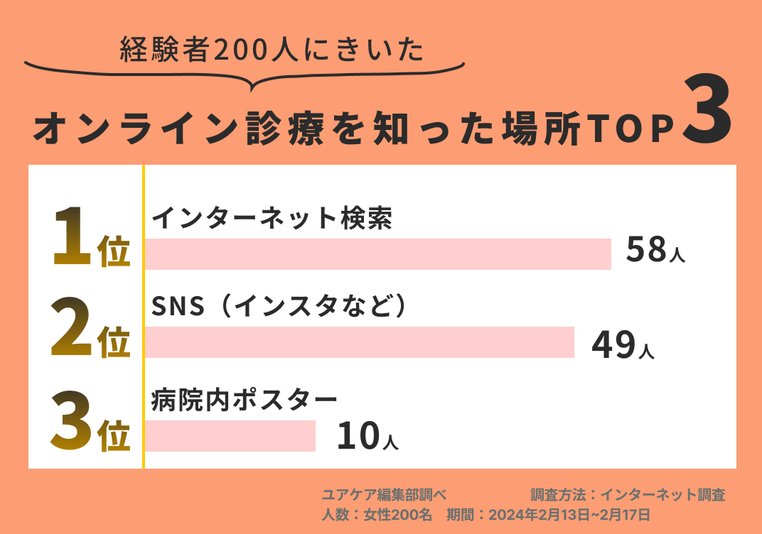 さらに、「知っていた」と回答した方にどこでオンライン診療を知ったか調査を行ったところ、以下のような結果に。