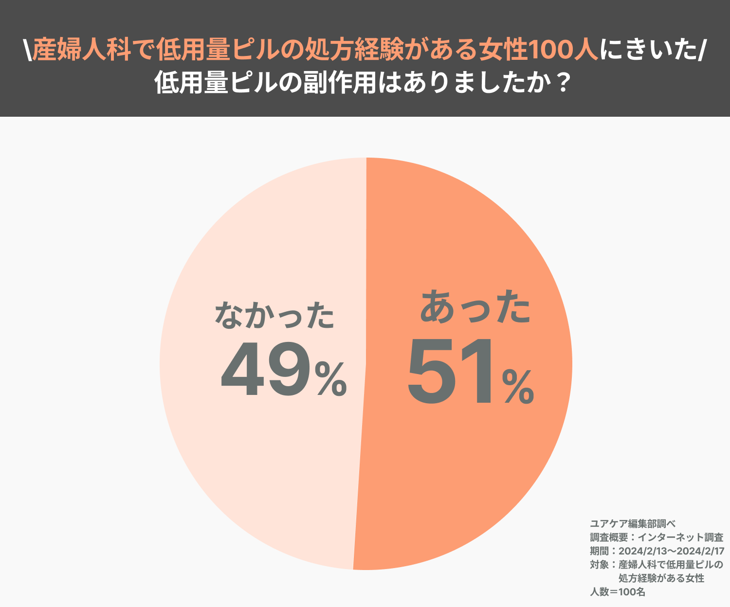アンケート回答者に、低用量ピルを飲んでいるときの副作用に関して聞いたところ、51%の方が「副作用があった」と回答しました。