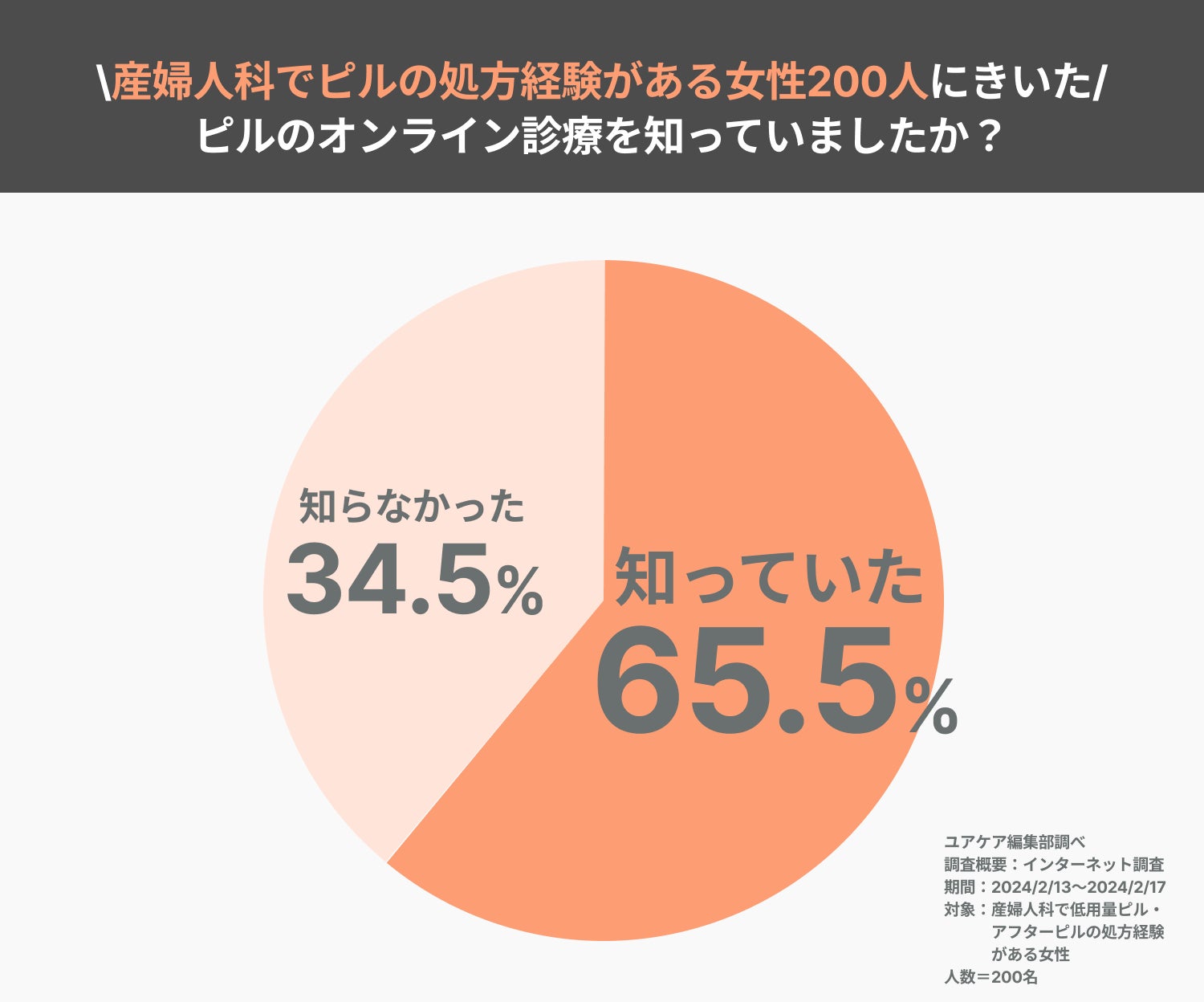 アンケート回答者に「ピルのオンライン診療を知っていましたか?」と聞いたところ、「知っていた」と回答した方は65.5%と、ほぼ3人中2人の方がオンライン診療の存在を知っていたうえで産婦人科でピルを処方してもらったことがわかりました。
