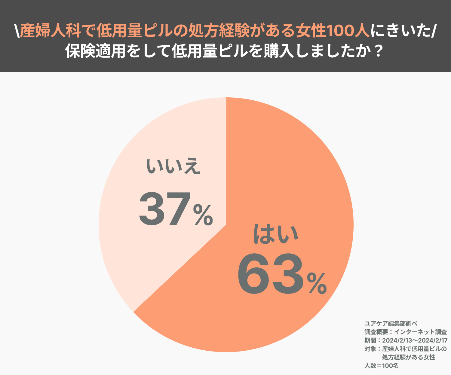 アンケート回答者に「保険適用をして低用量ピルを購入しましたか?」と聞いたところ「はい」と回答した人が63%おり、半数以上の方が治療目的で産婦人科を受診し、低用量ピルの服用をしていることがわかりました。