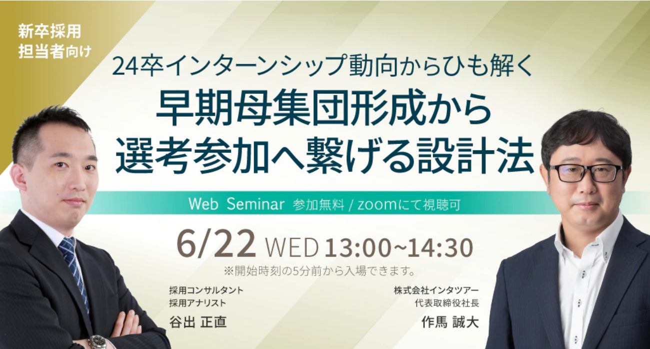 当セミナーでは、24卒インターンシップ調査や学生調査をもとに、早期母集団形成から有効なコンテンツ、本選考へ繋げる採用設計について、採用アナリストの 谷出 正直 氏と、株式会社インタツアー代表取締役 作馬 誠大 がディスカッションの中で紐解きます。