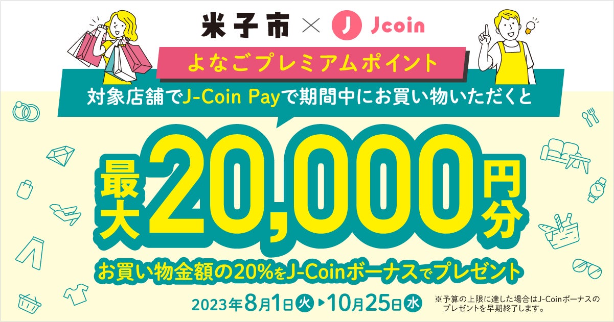 「よなごプレミアムポイント」事業とは米子市内の地域経済活性化のため、市内の対象加盟店で「J-Coin Pay」による決済をされた場合に、最大20%分の「よなごプレミアムポイント」を還元する取組となります。