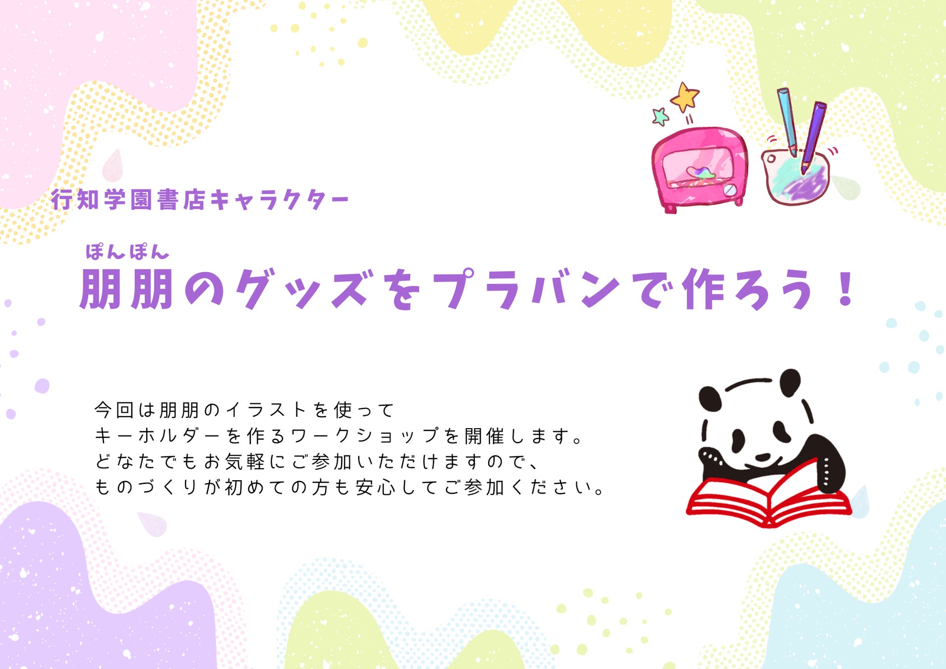行知学園書店のキャラクター、朋朋(ポンポン)のオリジナルイラストを使った、プラバンキーホルダー作りのワークショップを開催します。