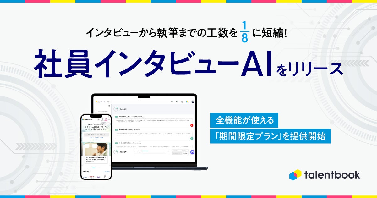 就活・転職活動に役立つキャリア学習サイト「talentbook」及び、法人向け採用マーケティング支援サービスを提供するtalentbook株式会社(本社:東京都渋谷区、共同代表取締役:大堀航/大堀海)は、2024年12月2日に「社員インタビューAI」をリリースいたしました。併せてtalentbookの全機能が使える「期間限定プラン」の提供を開始いたしましたことをお知らせいたします。