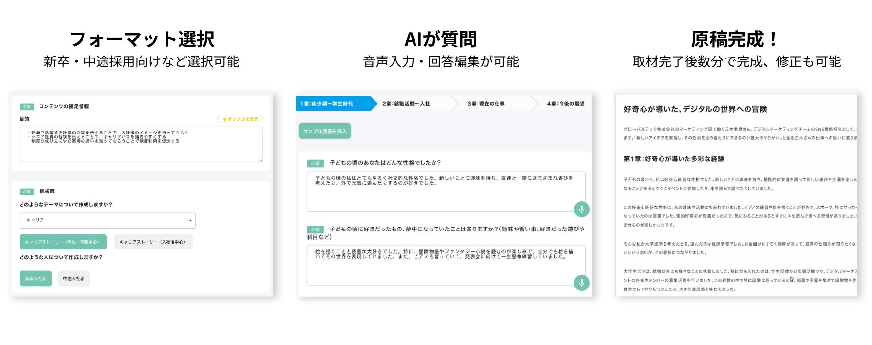 新卒採用やキャリア採用など目的・テーマに沿った質問が導き出され、AIの質問にあわせて音声入力を行っていくだけで、取材完了後数分で原稿が完成します。インタビューから制作までの1記事あたりの工数を従来の1/8に短縮可能となります(当社調べ)。