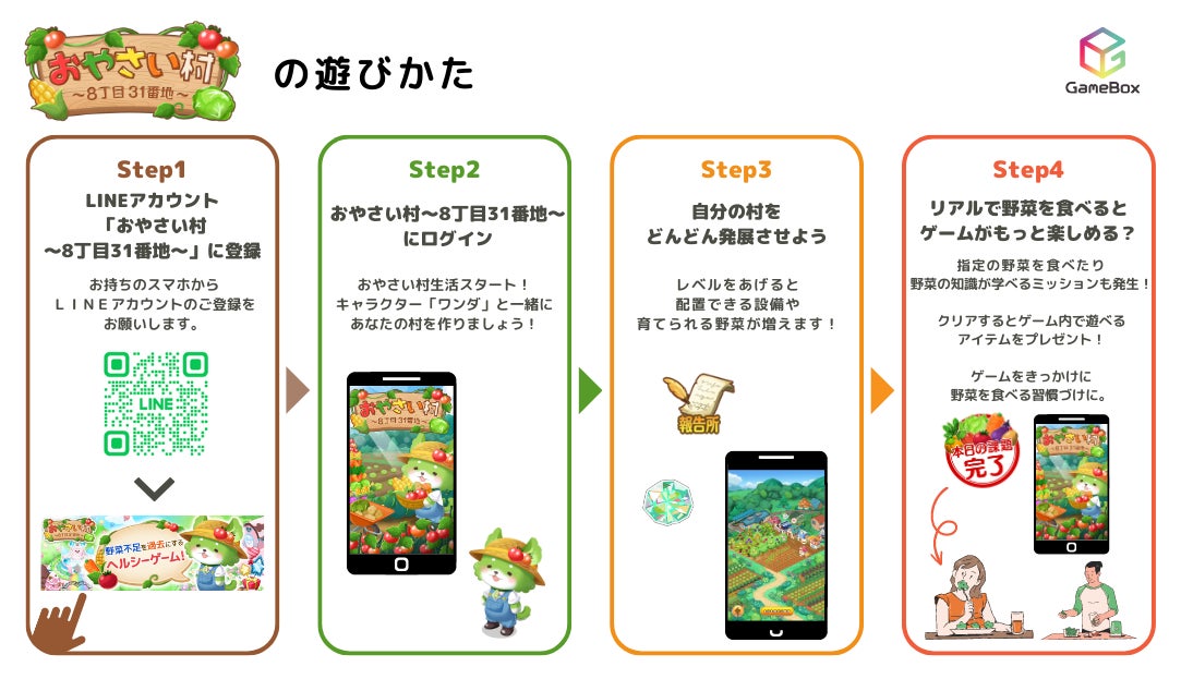 この『おやさい村~8丁目31番地~』は、当社が提供するCRM向けゲーミフィケーションサービス『GameBox』を活用して開発されました。