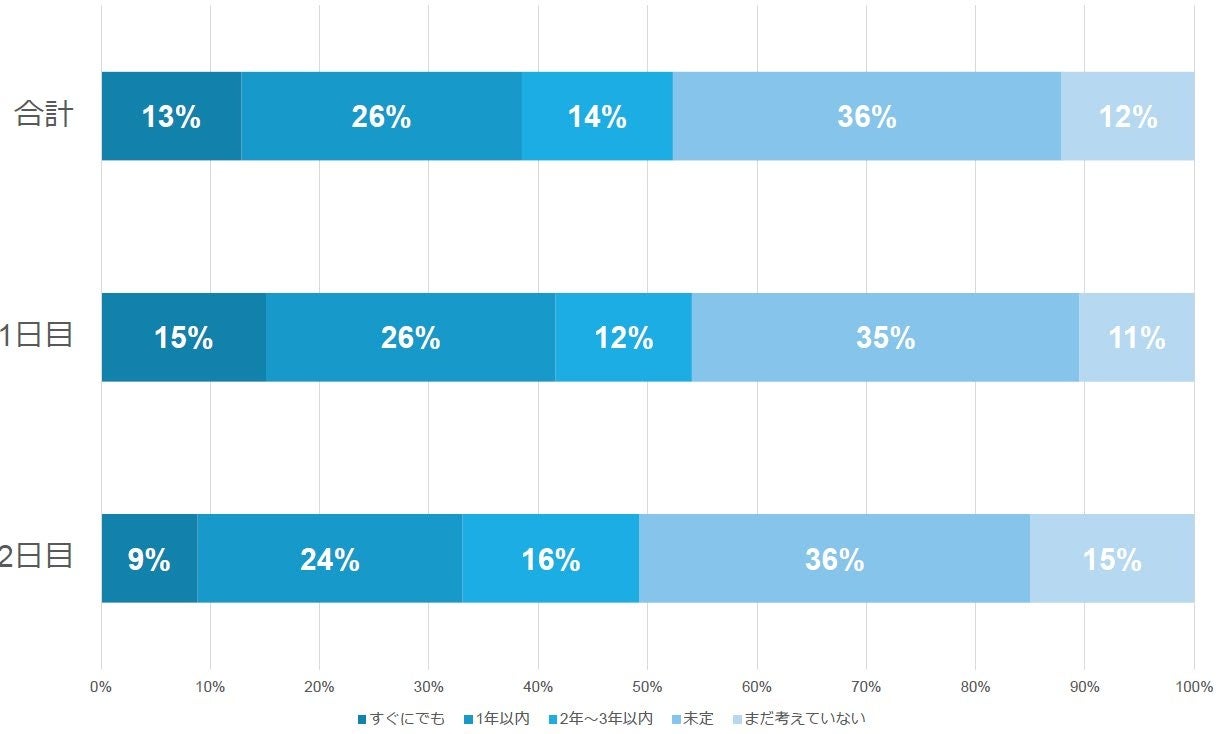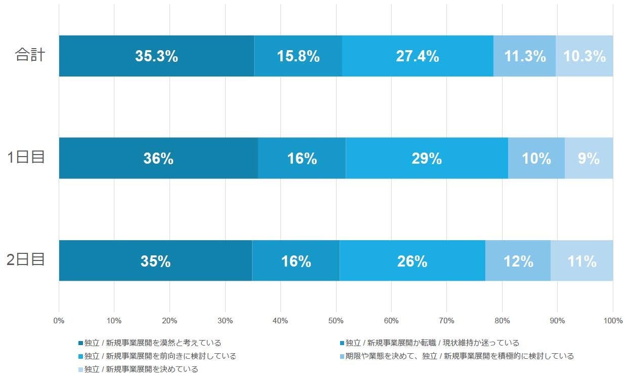 独立/新規事業展開の決意を固めている層は1割。全体の5割が独立/新規事業展開の検討に前向きと回答