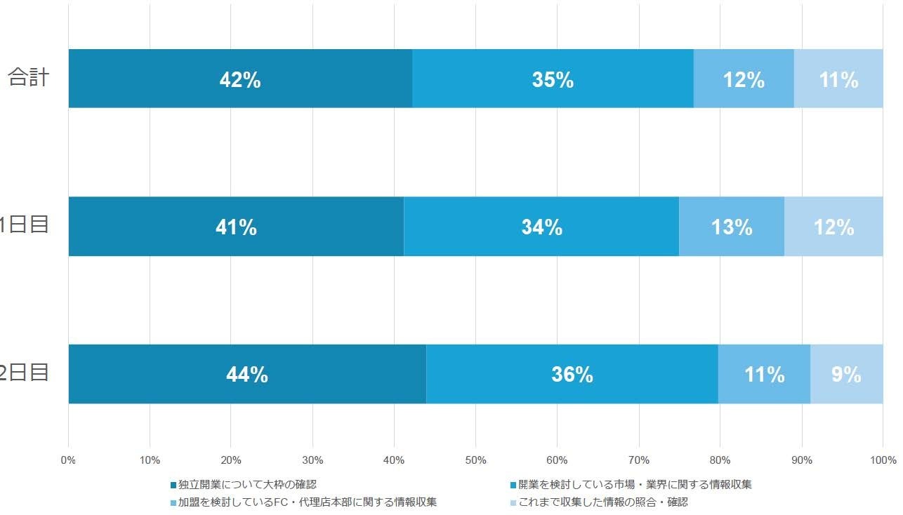 来場目的は独立開業の大枠確認(42%)、市場や業界の情報収集(35%)が主流