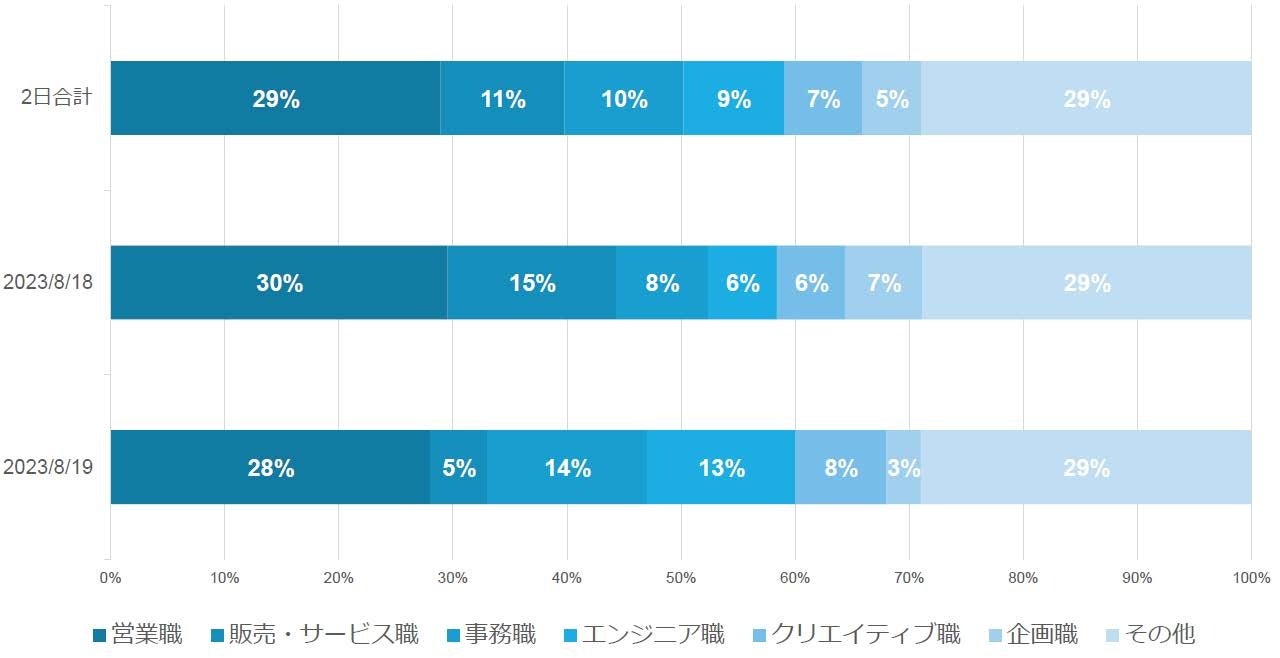 来場者属性は20代~50代と幅広く、退職を見越した50代の割合が昨年比+5%。女性の割合も約3割と高く、関心の高まりが見える。両日とも営業職の参加が最も多く、平日は販売・サービス職、休日はエンジニア職・事務職の参加が伸びたのが特徴。