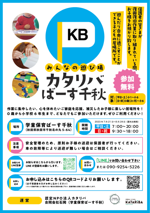 NPOカタリバ、秋田市豪雨災害で被災した子どものための居場所「みんなの遊び場・カタリバ ばーす千秋」を7/21(金)より開設