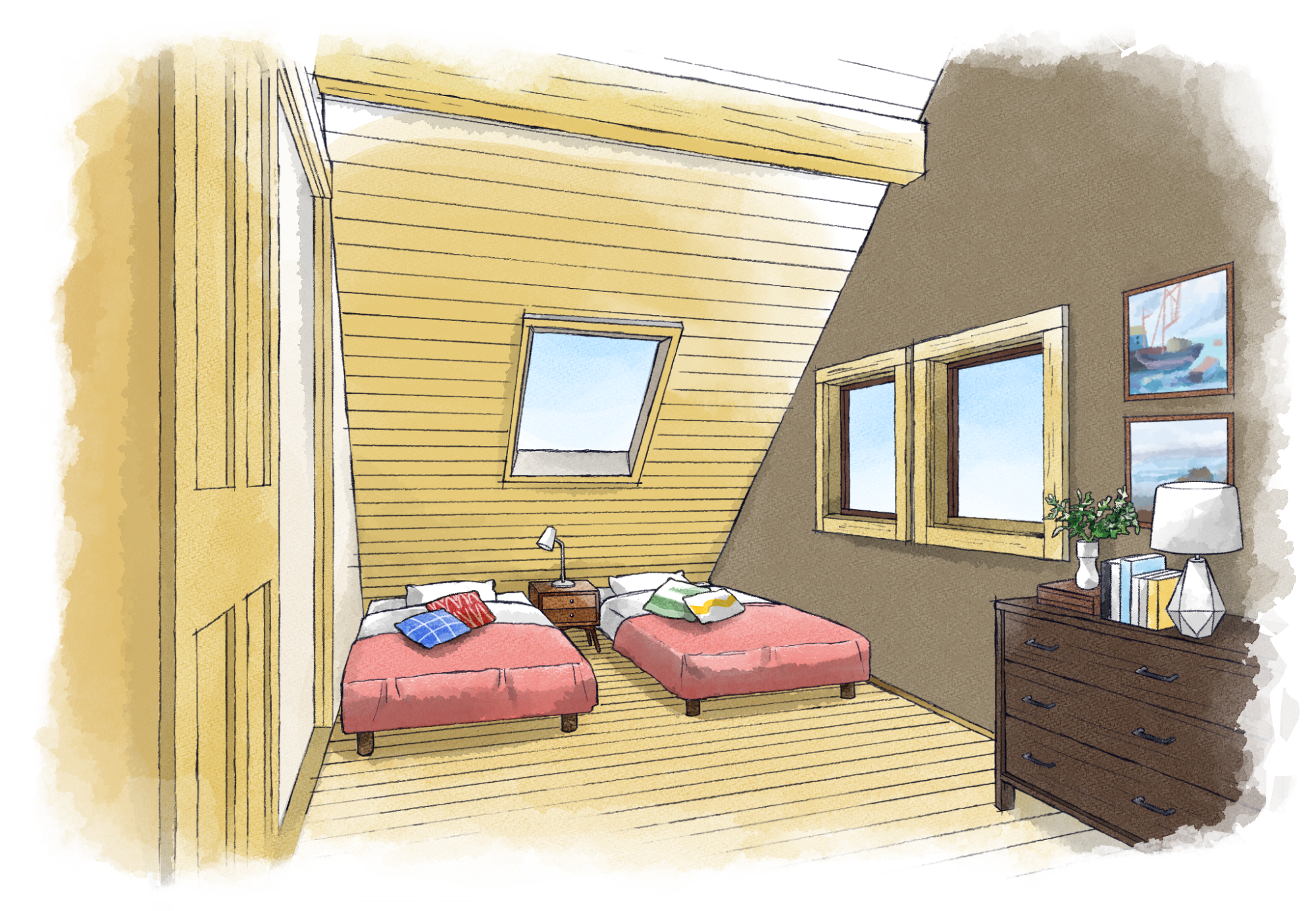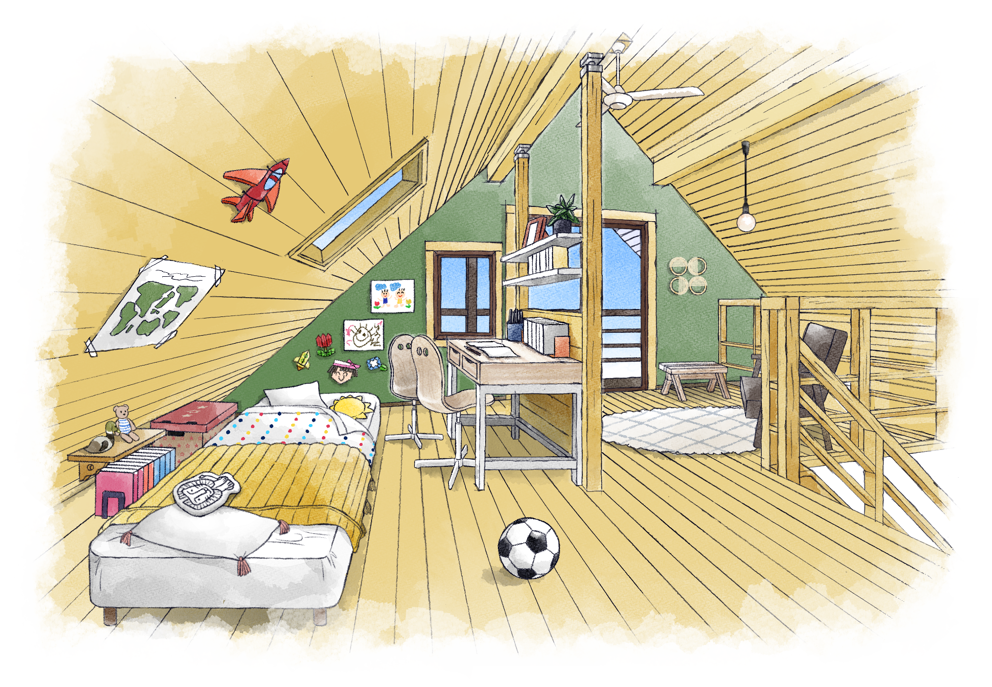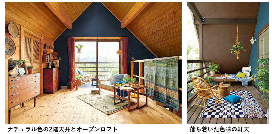 G-LOGなつは空に向かって伸びる三角屋根と、その下に広がる空中ベランダが特長で自然体の暮らしを楽しみたい人に人気のログハウスです。その発売から10周年を記念した特別モデル「コルリ」は、おおらかなオープンキッチンと三角屋根を存分に楽しめるオープンロフト、木のぬくもりが感じられる天井・軒天が特長。キッチンタイルやパントリーなどは好きな色の組み合わせを選べ、自分好みに楽しむ暮らしを提案します。