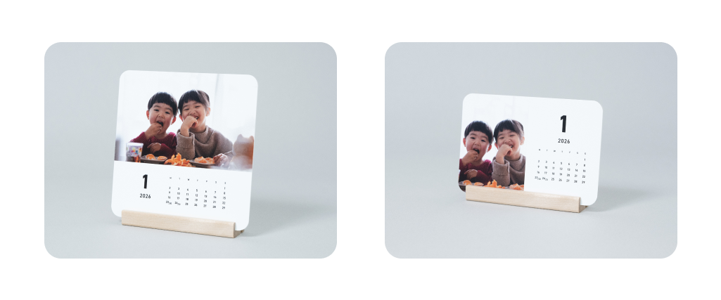 飾った時に曲がりにくく、さらさらとした上質な紙を使用。子どもが触っても安心な角丸加工を施しています。また、サイズも手に取りやすく飾っても丁度いい、卓上タイプのはがきサイズとましかくサイズをご用意いたしました。