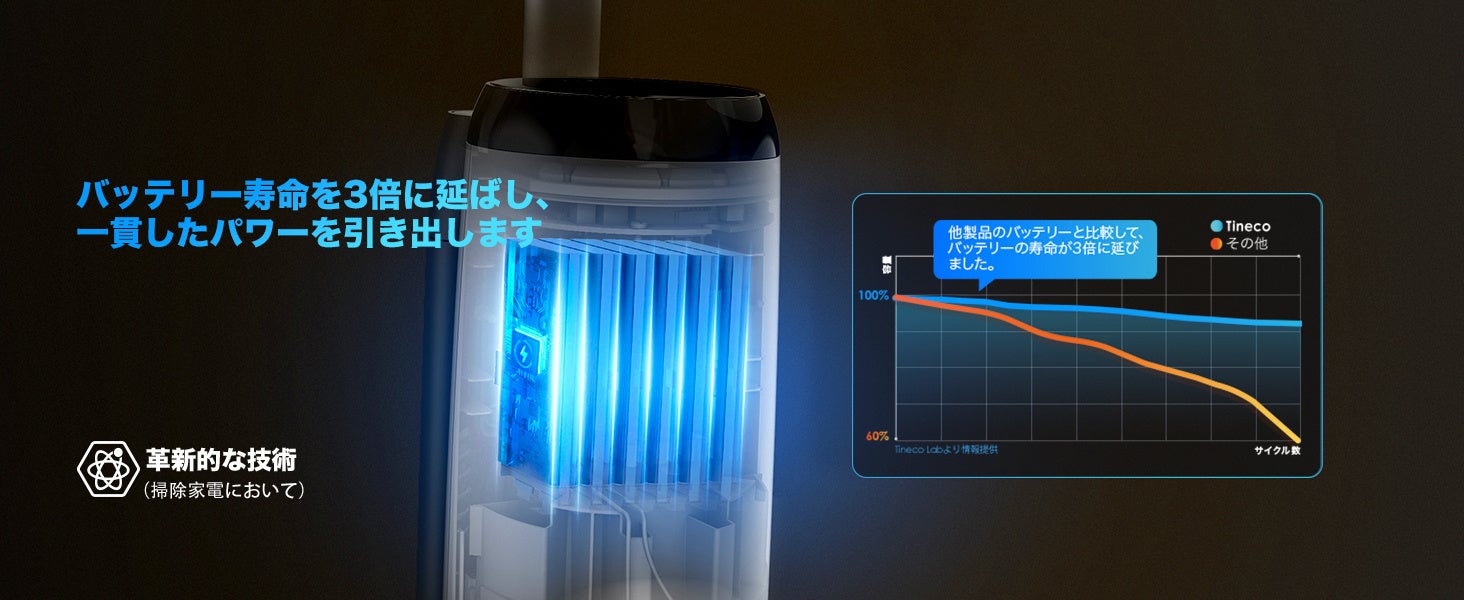 革新的なパウチ電池よりバッテリー寿命を3倍に延ばし、広いお部屋にも長時間稼働を実現します。