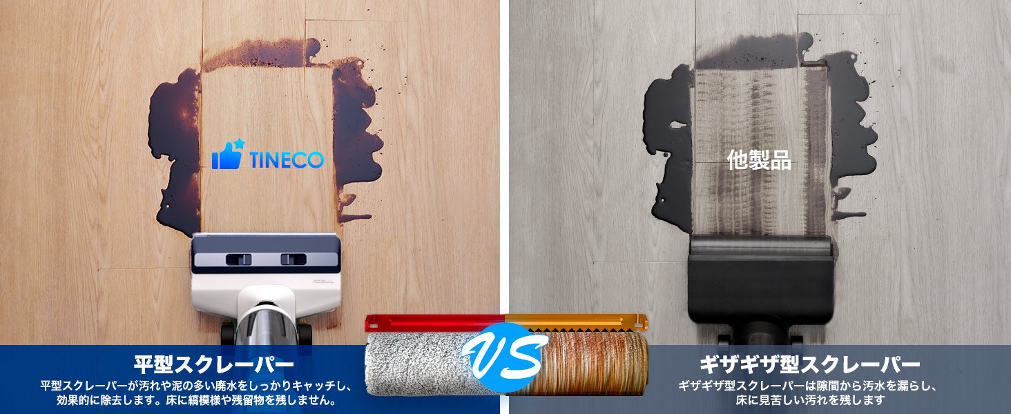 革新的なフラットスクレーパーがブラシローラーを徹底的に清掃し、床に戻る汚れを防ぎます。従来のギザギザ型スクレーパーは隙間から汚水を漏らし、床に見苦しい汚れを残すリスクがあると考えて、Tinecoは独自の平型スクレーパーを搭載しており、汚れや泥の多い廃水をしっかりキャッチし、効果的に除去します。