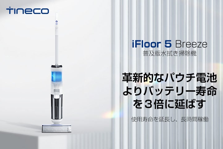 水拭き掃除機の研究を26年に続けているリーディングカンパニーであるTinecoは、普及版コードレス水拭き掃除機「iFloor 5 Breeze」「通常販売価格(税込):40,999円」は、床拭き掃除の課題解決を専念するのはもちろん、稼働時間やバッテリー使用寿命を持ち合わせた普及版水拭き掃除機モデルです。初めて水拭き掃除機を体験したい方に最適な商品となっております。なお、「iFloor 5 Breeze」では、「iFloor3シ」リーズより水タンクは30%アップし、運転時間が長くなり、広い部屋にも一気掃除できます。また、革新的なパウチ電池を搭載し、家電に一番大事のバッテリーについて使用寿命を3倍に延ばします。
