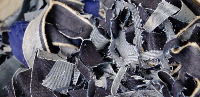今回、JOHNBULL がご用意するデニムコレクションには、それぞれのカラーごとに独自の加工やファブリックを用いています。ホワイトには古着を分解しリサイクルした糸を使用。ネイビーには同色のカットソーの裁断時に発生する裁断くずをリサイクルした糸を使用。ブルーグレーにはデニム生地を裁断する際に発生する裁断くずを使用しています。