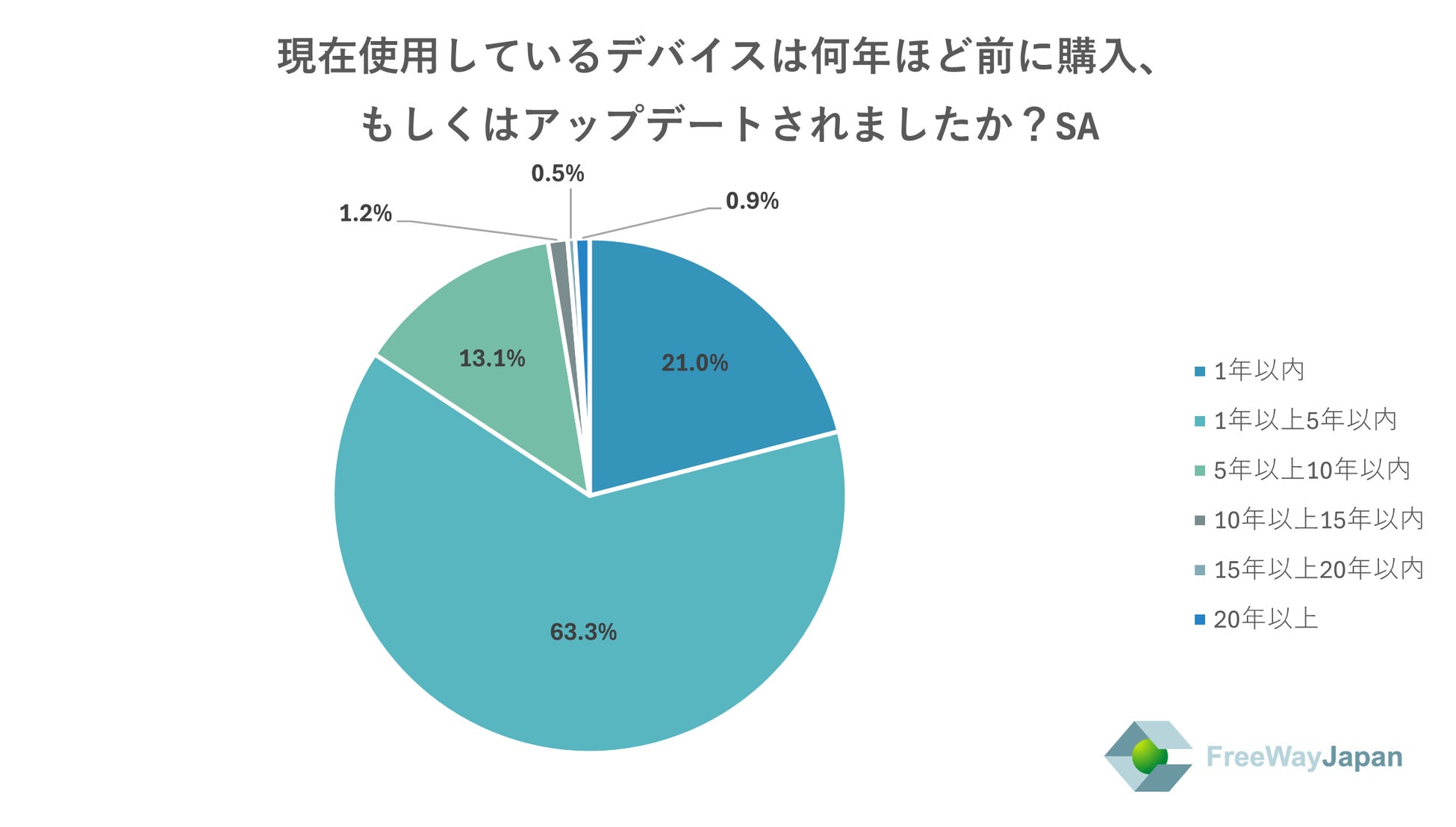 現在使用しているデバイスは何年ほど前に購入、もしくはアップデートされたか聞いたところ、「1年以上5年以内」が63.3%、「1年以内」が21.0%、「5年以上10年以内」が13.1%、「10年以上15年以内」が1.2%、「20年以上」が0.9%、「15年以上20年以内」が0.5%という結果だった。