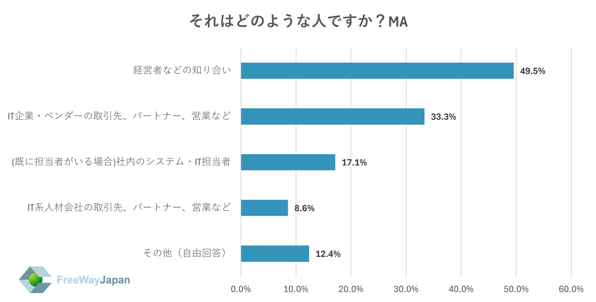 「はい」と回答した方に、相談相手がどのような人か聞いたところ、「経営者などの知り合い」が49.5%、「IT企業・ベンダーの取引先、パートナー、営業など」が33.3%、「(既に担当者がいる場合)社内のシステム・IT担当者」が17.1%、「IT系人材会社の取引先、パートナー、営業など」が8.6%、その他が12.4%という結果だった。