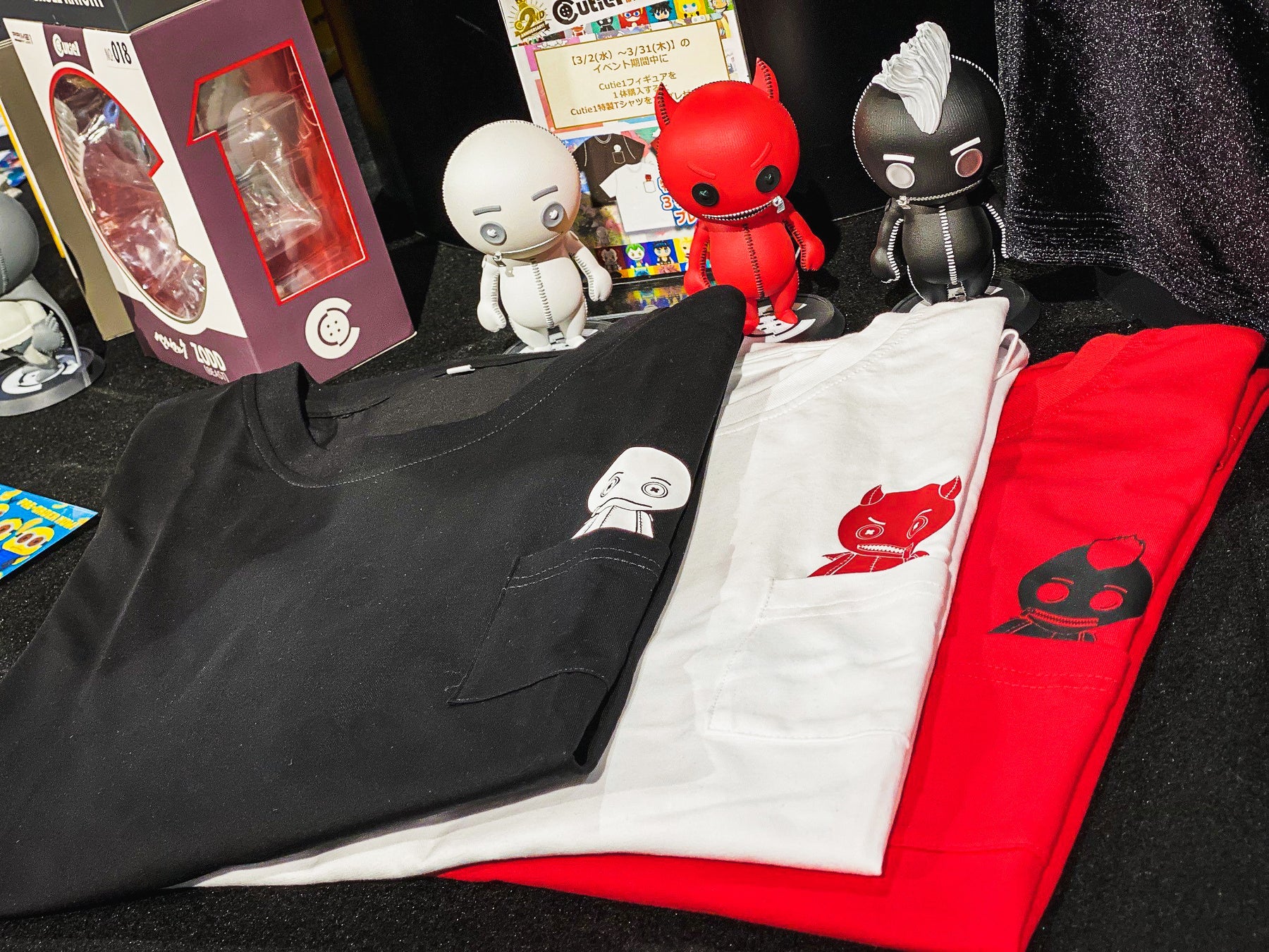 新宿ギャラリーショップで期間中にCutie1シリーズのフィギュアをどれでも1体ご購入いただいた方に、『Cutie1特製オリジナルTシャツ』を1枚もれなくプレゼントいたします!Tシャツは、Cutie1オリジナルキャラクターの「ブランク」「ロースト」「モッシュ」がポケットから顔をのぞかせる、ブラック・ホワイト・レッドの3種類(すべてフリーサイズ)。ぜひキュートに着こなしてくださいね!