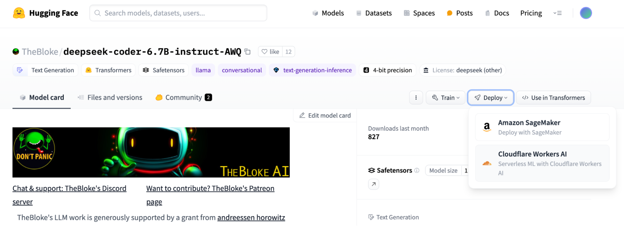 「Workers AI」の一般提供開始に伴い、開発者はAIモデルをHugging Faceからワンクリックで直接デプロイできるようになりました。これによって、CloudflareのGPUのグローバルネットワーク上の多彩なAIモデルにアクセスし、推論リクエストを実行する最速の方法が実現します。開発者は、人気のオープンソースモデルを選び、「Deploy to Cloudflare Workers AI」をクリックするだけで、すぐにAIモデルをデプロイできます。現在、Cloudflareのグローバルなサーバーレス推論プラットフォーム向けに最適化したHugging Faceモデルが14そろっており、テキスト生成、埋め込み、類似文章検索の3つのタスクカテゴリに対応しています。