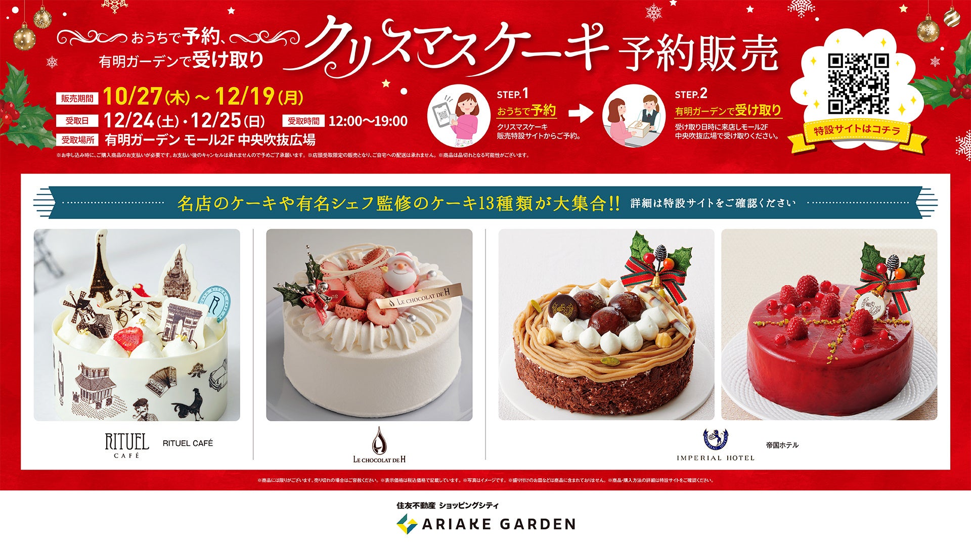 | クリスマスケーキ予約販売 予約期間:2022年10月27日(木)~12月19日(月) 受取日時:2022年12月24日(土)、25日(日)12:00~19:00 受取場所:有明ガーデン モール2F 中央吹抜広場 ▼有明ガーデンクリスマスケーキ予約販売の専用サイトはこちら http://ariakeevent.shop35.makeshop.jp/ |