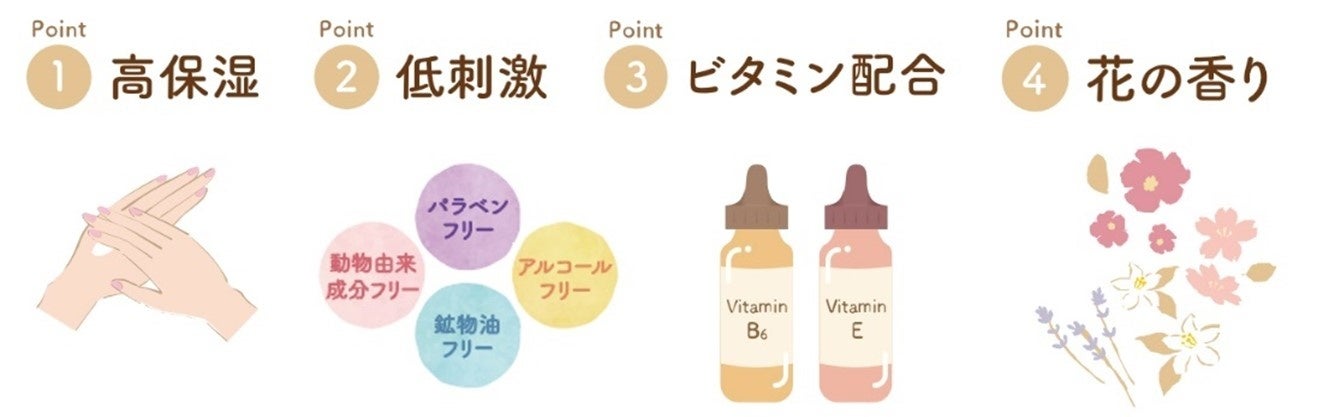 特長 | ・ ほんのり上品なキンモクセイの香り(微香性) ・ しっかりうるおす、こだわりの高保湿 ・ 手荒れを防ぐ高保湿処方 ・ 肌にやさしい低刺激、4つのフリー処方 「アルコールフリー」「パラベンフリー」「動物由来成分フリー」「鉱物油フリー」 |