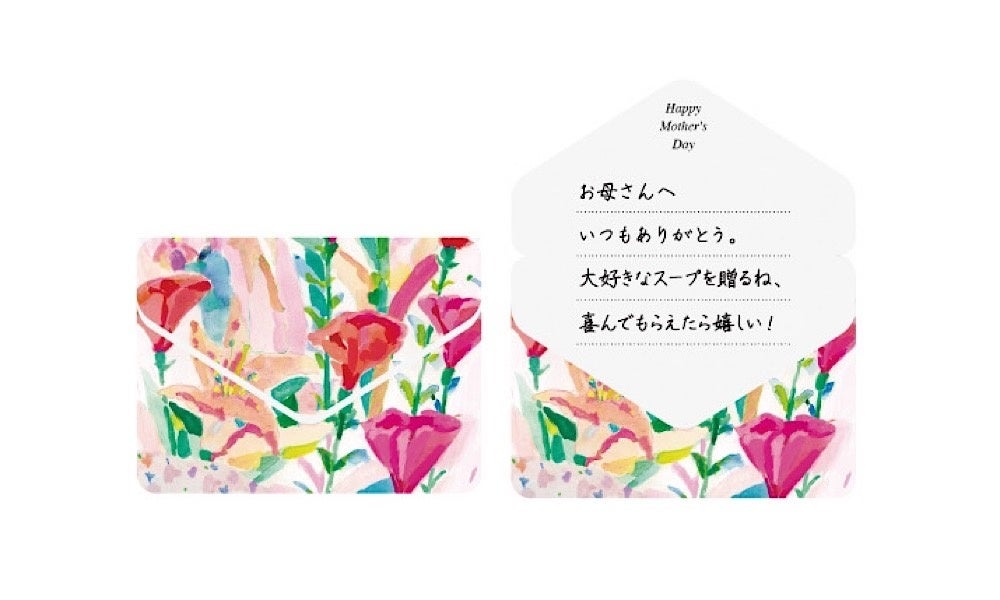 また、母の日限定の「メッセージカード」もご用意しています。気持ちを伝える方法は様々ですが、手書きで送るメッセージはなんだかちょっと特別です。一言二言でも、その想いに触れるだけで心も温かくなるはず。今年はお母さんへの感謝を手紙にのせて、スープと共に贈ってみませんか?