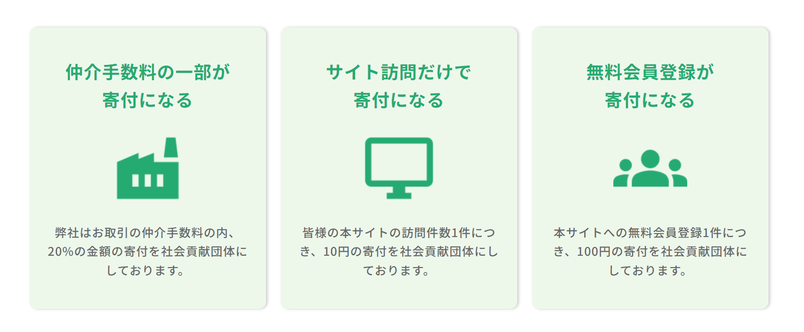 1.仲介手数料の一部が寄付になります(契約時に不動産会社へ支払う仲介手数料の内の20%が、グラミン日本を含む社会貢献団体へ寄付されます。更にお支払いされた企業名で広報が同時に行われます)。