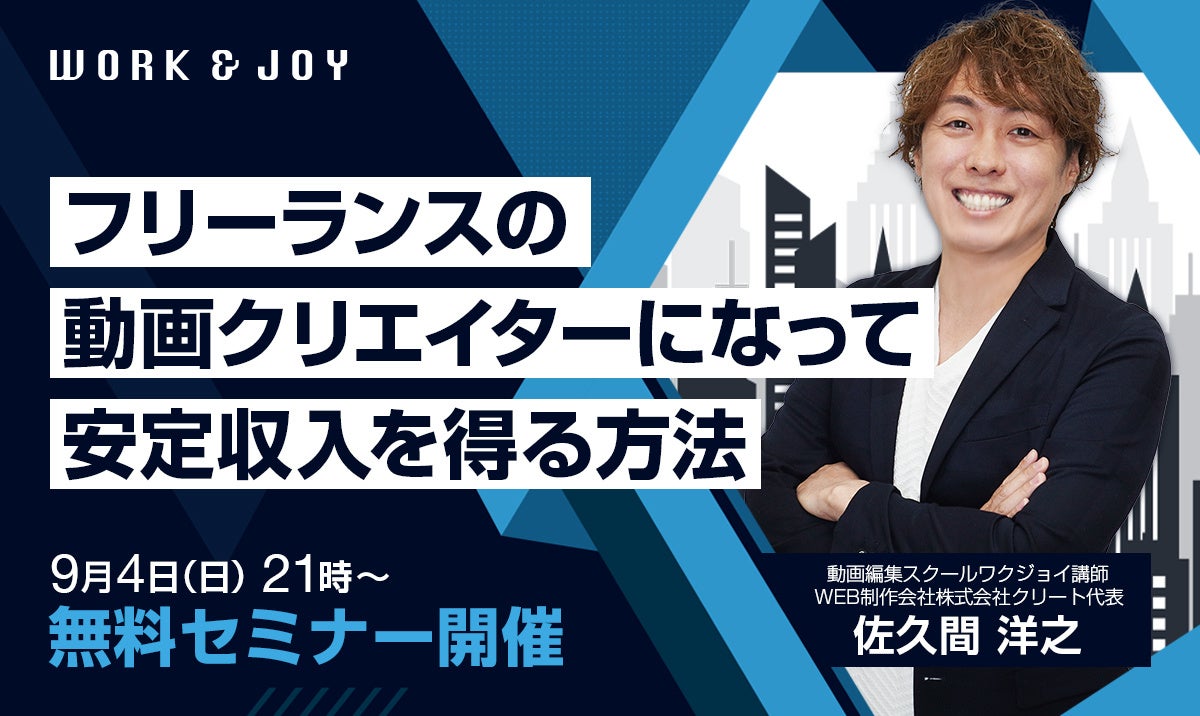 この度ワクジョイの運営主体である株式会社クリートでは、9月4日にオンラインにて、「フリーランスの動画クリエイターになって安定収入を得る方法」と題して、新たに動画編集技術を学びたい人向けに、技術面、マインド面、顧客獲得法など、継続的に成功するために必要なスキルを学べる無料セミナーを開催することをお知らせします。