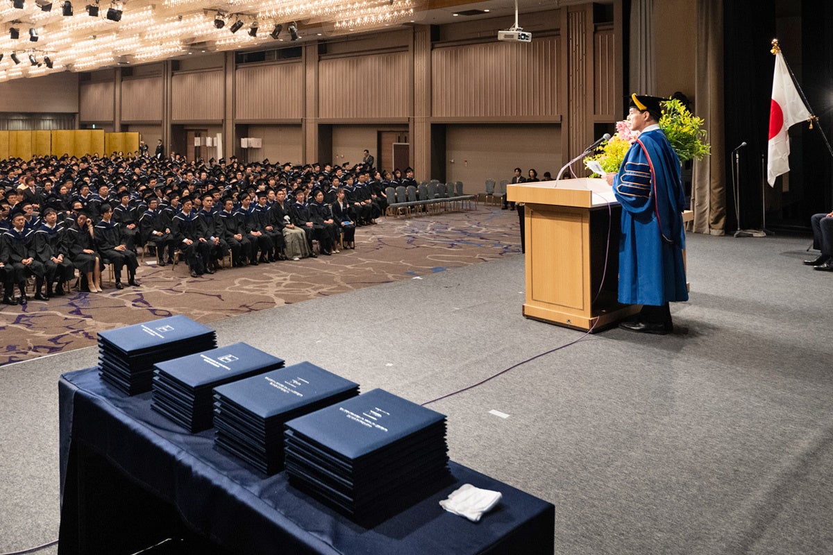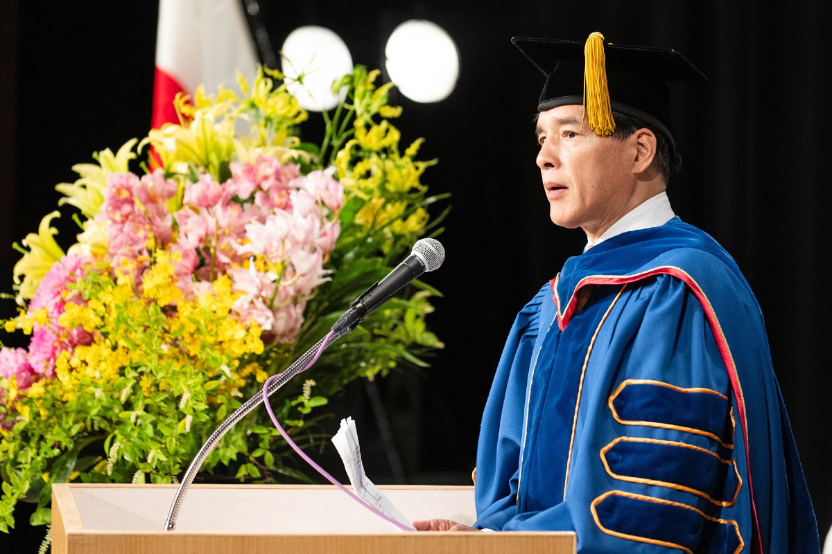 学位授与式(卒業式)で学長の堀義人は、「皆さんには、自らの果たすべき使命に向かい、その使命感から生まれる情熱のもと、世界観と歴史観、人生観と倫理観に従った『人間の軸』を持って邁進し、“創造と変革の志士”として大成してほしい。大いにリスクをとって挑戦し、試練を楽しみながら、成長していただきたい」と式辞を述べました。