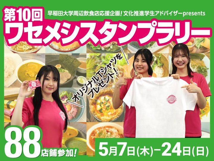 誰でも参加できる、好評のワセメシスタンプラリー。期間中に参加店舗で飲食かテイクアウトをして5つのスタンプをゲットしよう。スタンプカードは参加各店舗で配布。カードの在庫がなくなる場合があります。ご了承ください。5つのスタンプを集めて応募した方に、抽選で1000名様に「オリジナルTシャツ(非売品)」をプレゼント!
