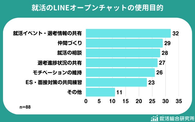 就活のLINEオープンチャットの使用目的として最も多かったのは、「就活イベント・選考情報の共有」(32人)でした。次いで「仲間づくり」(29人)、「就活の相談」(28人)、「選考進捗状況の共有」(27人)、「モチベーションの維持」(26人)と続き、多くの就活生が情報収集だけでなく、精神的な支えや横のつながりを求めて利用していることがわかります。