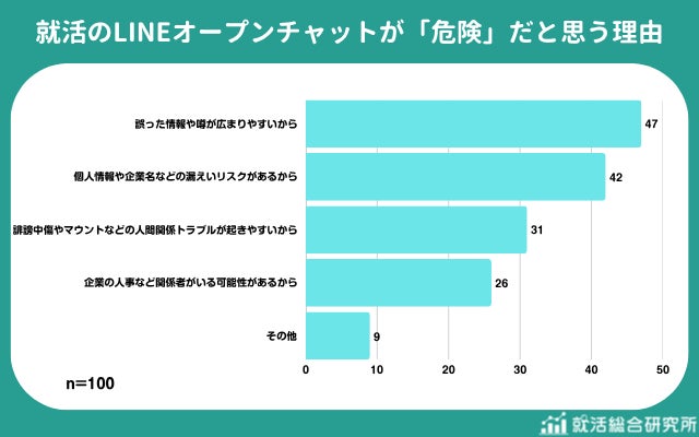 就活のLINEオープンチャットが「危険」だと思う理由としては、「誤った情報や噂が広まりやすいから」(47人)と「個人情報や企業名などの漏えいリスクがあるから」(42人)が特に多く挙げられました。情報の正確性やプライバシー保護に対する強い不安が、危険視される主な背景となっています。