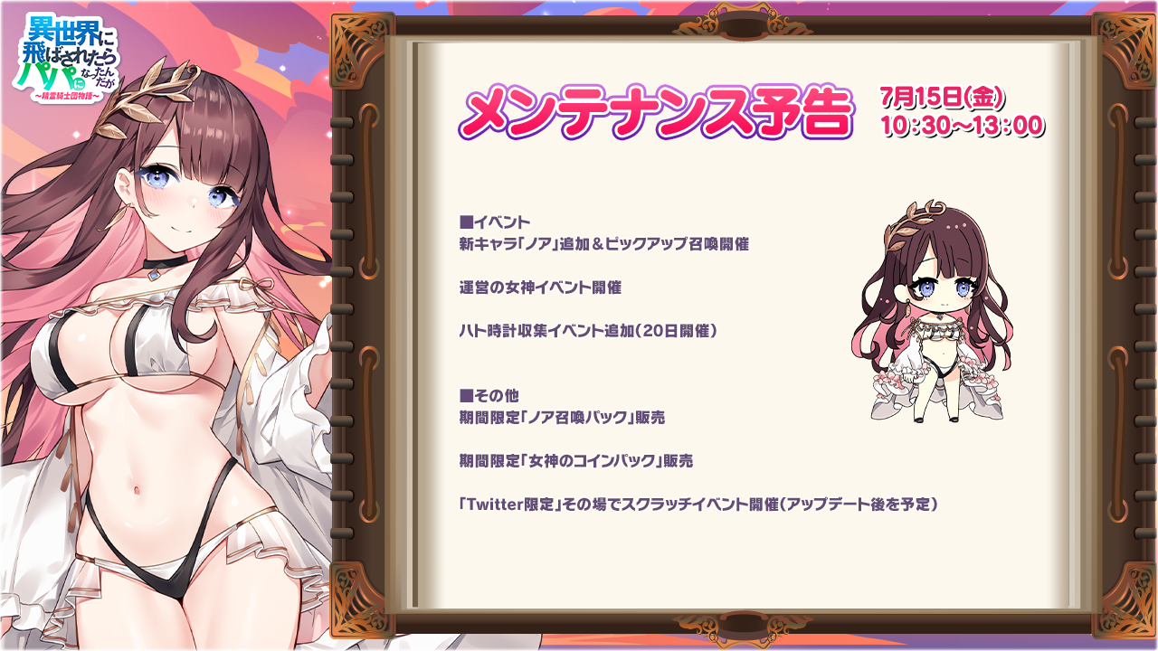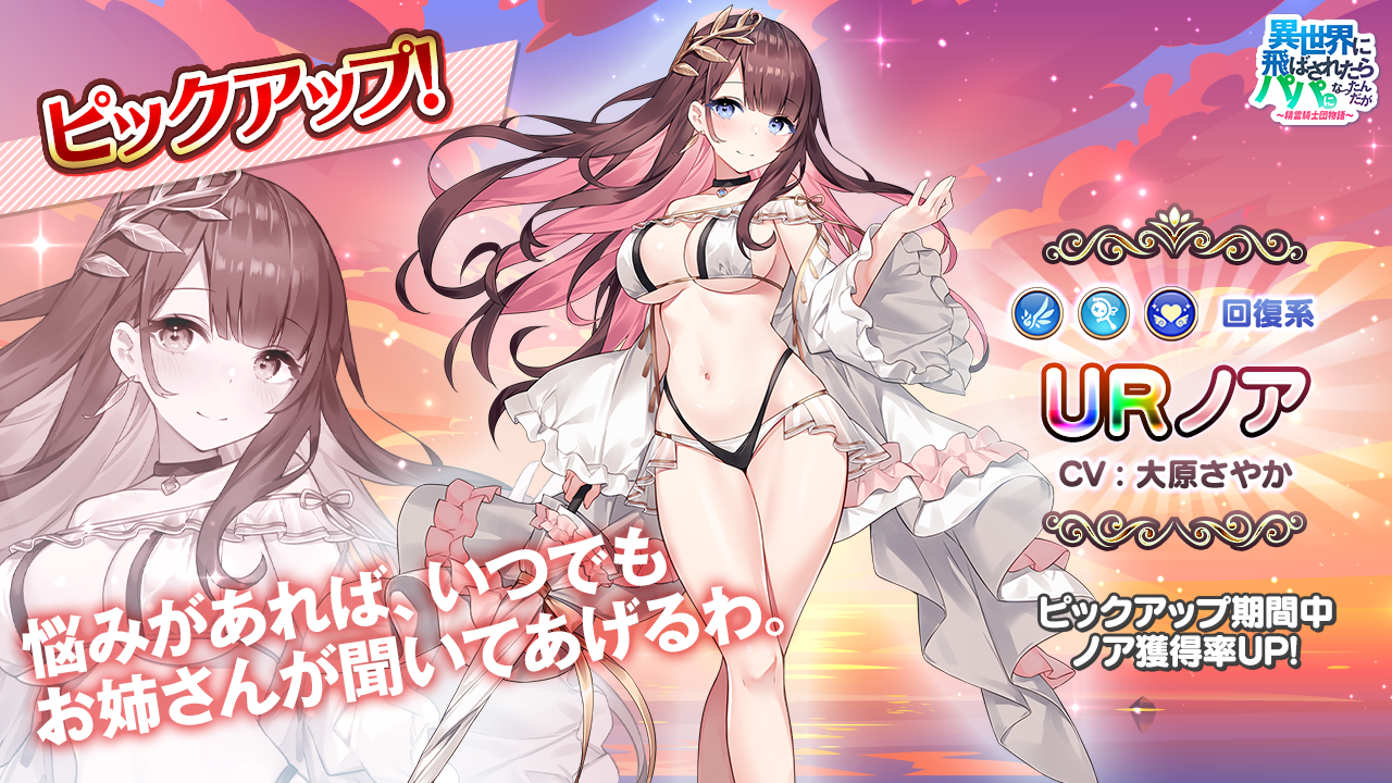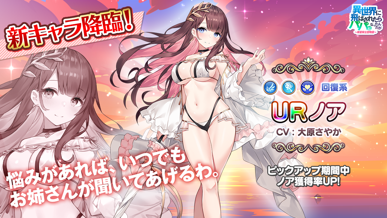 『異世界のパパ』大原さやか声優担当の新キャラ“ノア”登場!大人気運命の女神イベント/パーティレイド報酬1.5倍/収集イベント!さらに最大3000円分のAmazonギフト券が当たるイベントも実施!